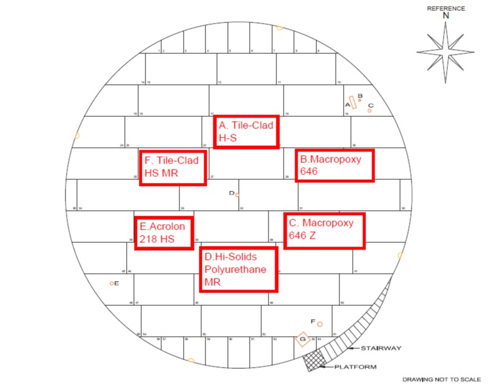 FIG. 2. On the tank’s roof, applicators prepared six large areas and applied the three coatings in two different formulations each: one with an active MR additive to mitigate Dothideales spp growth and the other without the additive as a control.