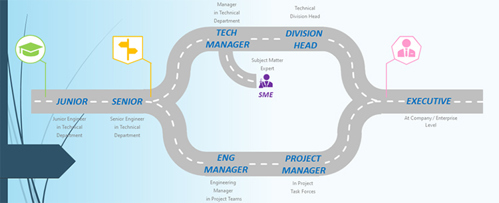 For example, we have represented a possible growth path within a design company that has its core business in the energy, oil and gas, and petrochemical sectors (FIG. 1). We know that companies are different, each with their own peculiarities, and what follows is not exhaustive. There are many facets and, fortunately, infinite career possibilities.