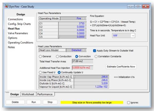 For this case study, a constant heat flux through the fire duration is considered by specifying C1, and setting C2, C3, C4, and C5 to zero. C1 is specified as such: API recommended heat flux for pool fire in (kW/m2) as tabulated in TABLE 3 multiplied by the heat transfer area (m2) resulting in applied heat in kW.