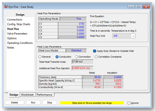 Heat loss parameters. A detailed heat loss model is used along with specifying the metal thickness for conductive heat transfer and taking no credit for the vessel insulation. It is necessary to ensure the fire duty is applied to the outside vessel wall, as shown in FIG. 6.