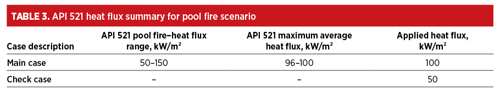 Pool fire experiments outlined in API 521 recommend a maximum average heat flux of 96 kW/m²100 kW/m². For this case, the average heat flux of 100 kW/m² was applied to account for the worst-case scenario, while a secondary check case was performed at a lower heat flux of 50 kW/m² for comparative analysis. Refer to the summary in TABLE 3.
