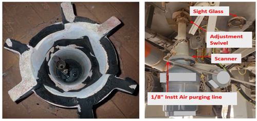 FIG. 4. Coke formation on the burner’s tiles (left), and the flame scanner arrangement (right).