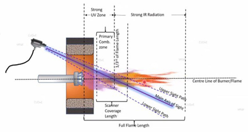 Reliabilities of safety related instruments. The effectiveness of safety systems depends heavily on the reliability of instrumentation, including flame scanners, burner designs and combustion related sensors. In relation to flame scanners, UV sensors are commonly preferred for fuel gas applications due to their strong signal response; however, proper alignment is essential to accommodate varying flame profiles and ensure an accurate sight path, as highlighted in FIG. 3. Dual-scanner configurations combining UV and IR technologies further enhance detection accuracy across a range of fuel types, improving system reliability and reducing the risk of false shutdowns.