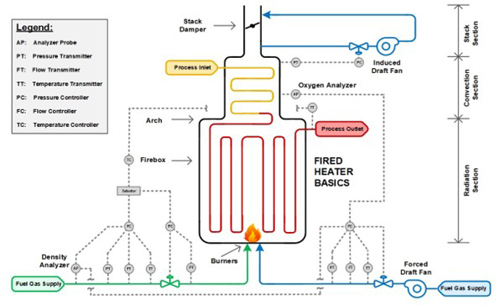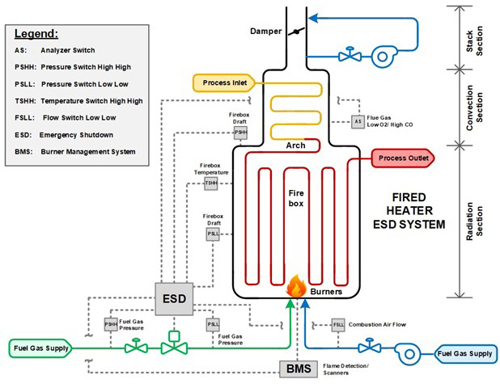 Fired heaters overview. Following several safety-related incidents over several years, the industry has implemented improvements in BMSs, flame detection, air combustion and draft control, mechanical design and ESD integration. Fired heaters are essential in crude oil refining and chemical operations, supplying the necessary thermal energy for fluid-phase reactions and separation by combustion-driven heat transfer from different fuel sources. A simplified illustration of fired heater basics with instrumentation is shown in FIG. 1.