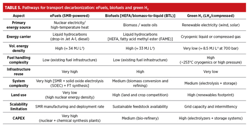 The competition (biofuels, green eFuels) depends on regional resources. Nuclear could be one major source of the required clean H2 and process energy to manufacture those fuels at scale. Conversely, if direct electrification (batteries for trucks/short-haul planes, etc.) reduce liquid fuel needs, the market for synthetic fuels might remain limited to long-haul aviation and certain chemicals (TABLE 5).