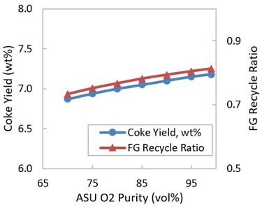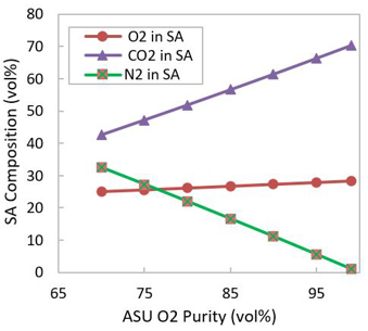 The composition of SA and CO2eFG depends on the purity of the O2 stream from the ASU and the flue gas recycle ratio. A few possible SA compositions and the corresponding CO2eFG composition are given in FIGS. 2 and 3, respectively. Air with 4 vol% moisture and 5.9 wt% coke yield with 6 wt% H2 content in coke are considered for these calculations.