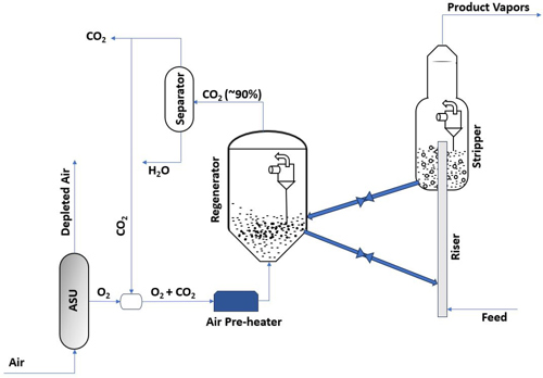 In FCC, pre-combustion carbon capture is not an option because catalyst regeneration is an unavoidable carbon source. However, CO2 capture routes like post-combustion carbon capture and oxy combustion can be implemented in FCC operations. Post-combustion capture, however, is not economically viable due to low CO2 concentration, its substantial volume and contaminant content, significant investment and OPEX.11 One of the studies in literature shows that the CO2 capture cost for oxy-combustion is ~45% lower compared to a post-combustion amine absorption alternative.12,13