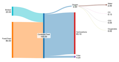 The yield structure impact of coprocessing bio-derived feed streams cannot be generalized apart from the increased yields of water, CO and CO2. As such, the amount of the biofeed coprocessed contributes to the sellable product pool based on the rate minus oxygen in feed, coke and dry gas yields. Some biogenic carbon is lost from the product pool via the conversion of oxygen to CO and CO2. With lipidic feedstocks, nearly all oxygen is converted to water and carbon oxides (COx) (CO and CO2), and the product distribution is about 80:10:10 for water, CO and CO2, respectively, with trace levels of oxygenate byproducts present in liquefied petroleum gas (LPG), cracked naphtha and heavier liquid streams.