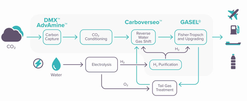 • Norske eFuel: This is Norway’s first industrial scale eFuel facility.5 The project will use the advanced RWGSb,e process to convert COto CO for F-Tc,d conversion and downstream upgrading units. Also, extensive integration of all processing schemes minimizes the facility’s footprint. The eFuel plant will produce 1,000 barrels per stream day (bpsd) of liquid product from biogenic CO2. Using renewable electricity for energy needs, the finished products meet eFuel submandates of the European regulation, ReFuelEU.6