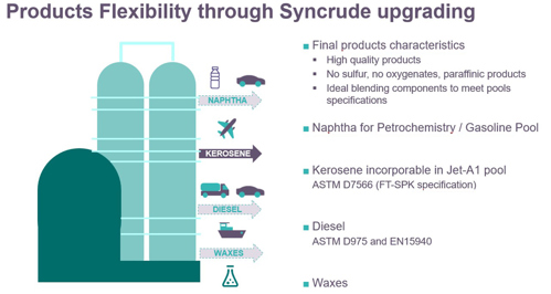 Final products meet industry and transportation standards, specifically ASTM D-7566 for kerosene. The absence of sulfur, nitrogen and aromatics create final product blending values relative to their fossil-based counterparts. Multiple upgrading schemes provide the flexibility to produce a wide product slate, including petrochemical grade naphtha, renewable diesel, sustainable aviation fuel (SAF) and specialty products (waxes or base oils).