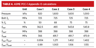 To maintain some margin for gasket and bolt relaxation, it was decided to keep the bolt stress at 75% Sy, and Appendix O calculations were performed for hydrostatic test pressure in uncorroded condition (Case 3) and design pressure in corroded condition (Case 4). For Case 3, it can be seen from TABLE 4 that there is approximately 10.6% of extra bolt stress available for the gasket in operating condition, while for Case 4 there is approximately 15.5% of extra bolt stress available.