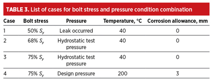 TABLE 4 helps to identify the root cause of the leakage. The initial bolt stress of 50% Sy applied in Case 1 was an input from the user (maybe derived from past experience). It can be understood that the leakage occurred at hydrostatic pressures between 940 kPa(g) and 960 kPa(g). At these pressures, the bolt stress for the gasket in seating condition as well as in operating condition exceeded the applied (selected) bolt stress.