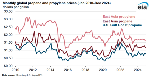 Meanwhile, the large supply of propylene from increased production amid growing propane dehydrogenation capacity in East Asia has led to low propylene spot prices. East Asia propylene prices averaged $1.63/gal last year, the lowest since 2020. Despite low propylene prices, propane demand for petrochemical consumption remains high.