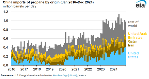Propane demand in China has grown rapidly, reflecting a wave of new propane dehydrogenation units, which manufacture propane into propylene. In 2024, most of the propane imports into China originated in the United States (32%), followed by Iran (17%), Qatar (7%), and the United Arab Emirates (UAE) (3%).