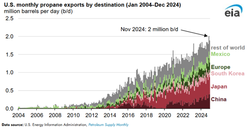 Growing propane demand in Asia. Annual U.S. propane exports to Asia grew 13% in 2024 compared with 2023, a 131,000-bpd increase, with most going to Japan, South Korea and China. Chinese consumption accounts for most of the growth in U.S. exports to Asia; U.S. propane exports to China grew by 40% in 2024. Increasing propane exports to Asia are driven in part by the region’s increasing demand for propylene. Propylene is used to manufacture polypropylene, a versatile plastic used in many products including car interiors, packaging, and personal protective equipment.