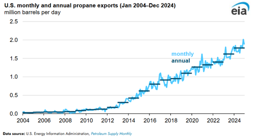U.S. propane exports averaged a record 1.8 MMbpd in 2024, the most since the U.S. Energy Information Administration (EIA) began collecting this data in 1973. U.S. propane exports increased for each of the last 17 years, with growth driven by higher demand in East Asia, mainly China, and a widening propane price differential between U.S. and global benchmarks.
