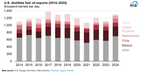The largest destination for U.S. distillate exports is Mexico, which accounted for 272,000 bpd (21%) in 2024. Other major destinations included Chile (110,000 bpd), the Netherlands (103,000 bpd), the UK (81,000 bpd) and Peru (74,000 bpd).