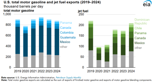 In 2024, exports of U.S. motor gasoline, including both finished motor gasoline and motor gasoline blending components, totaled 877,000 bpd, or 24,000 bpd less than in 2023. Mexico is the largest destination for U.S. gasoline exports, accounting for more than half of 2024 exports at 495,000 bpd. Other destinations for U.S. gasoline exports are generally concentrated in the Western Hemisphere, such as Guatemala, Colombia, Canada and Panama—the next-largest destinations by volume in 2024.