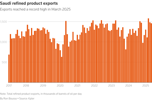 Saudi's refined product exports, which include diesel, gasoline, jet fuel and fuel oil, rose to a record 1.58 MMbpd in March, before declining to 1.48 MMbpd in April and 1.42 MMbpd so far in May, according to data from ship tracking firm Kpler, likely reflecting refinery turnaround.