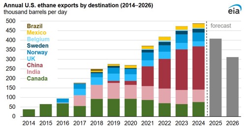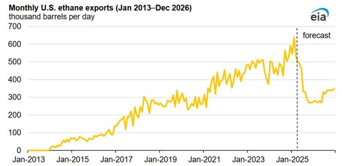 We forecast U.S. ethane exports will decrease by 80,000 bpd this year and by 177,000 bpd in 2026 in our June Short-Term Energy Outlook because of new licensing requirements U.S. exports of ethane to China. Any policy changes that relax licensing requirements, such as the outcome of trade negotiations between the United States and China, would lead us to increase our forecasts for U.S. ethane exports again.