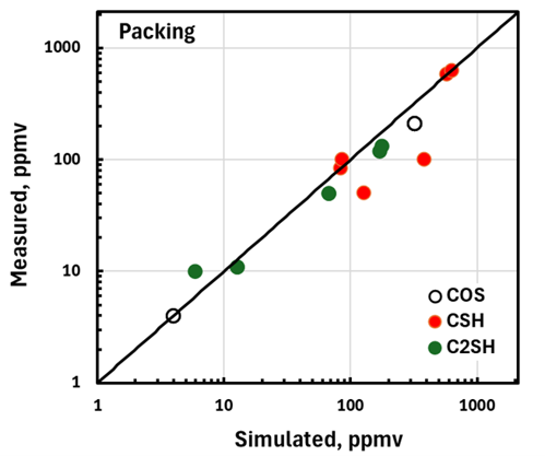 The simplest way to compare simulation with plant measurements is on a parity basis. FIGS. 3 and 4 compare measured and simulated mercaptans and COS levels in the treated liquid from trayed and packed columns, respectively. Given the approximations and estimates that had to be made to fill in missing data from sometimes sketchily documented equipment and operating conditions, the extent to which simulations reproduce performance metrics is remarkable. It should be emphasized that the simulated results shown here are, in every sense, pure predictions. They certainly lend credence to the efficacy of the fundamental model used as the basis for the simulator. It seems that most of the treater details germane to tray and packing performance in sour, liquid-hydrocarbon service have been properly quantified.