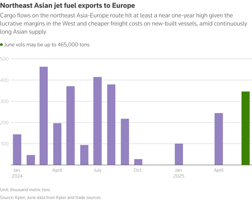 - NE Asia ships up to 465,000 tons (t) of jet fuel to Europe in June