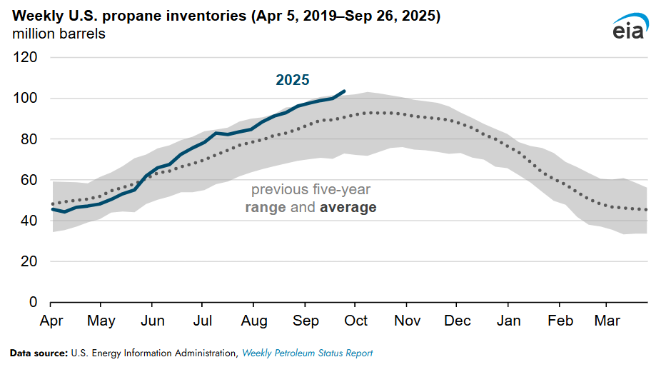 The United States is well stocked with propane heading into the winter. For the week ending September 26, U.S. propane inventory was 103 MMbbl, about 13 MMbbl more than the previous five-year average for this time of year, based on data in the U.S. Energy Information Administration’s (EIA’s) Weekly Petroleum Status Report.