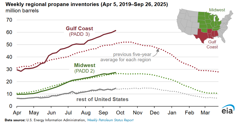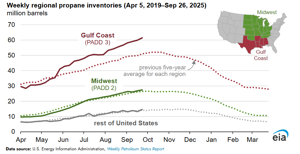 The Gulf Coast, where most U.S. petrochemical consumption and propane export capacity are located, accounts for about 70% of U.S. propane storage capacity. Propane inventories in the Gulf Coast region are at 61 MMbbl for the week ending September 26, about 21% higher than the five-year average.