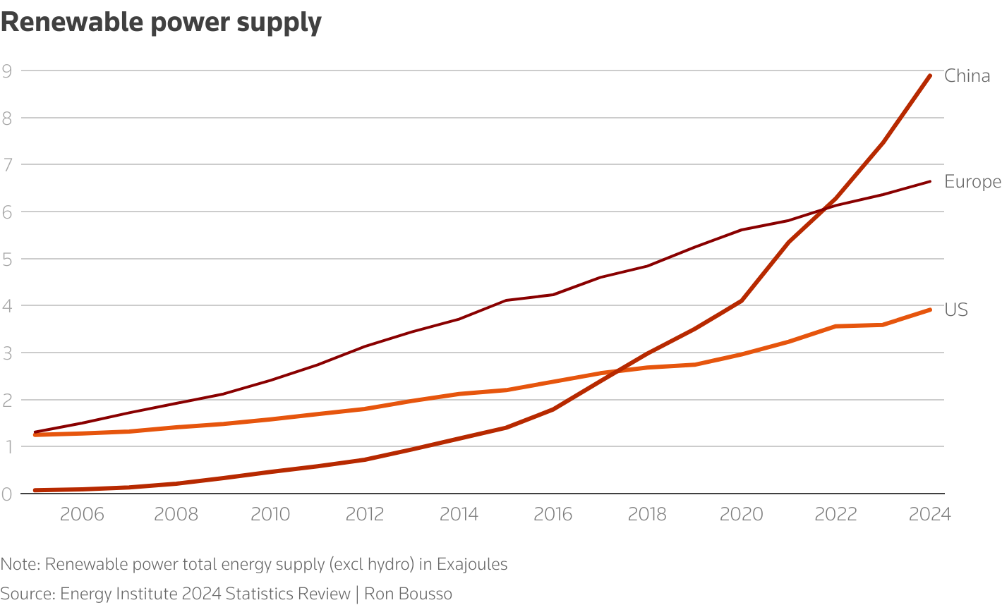 Europe, like China, is seeking to reduce energy imports, but its heavy investment in renewables has proven expensive and subject to its own risks, given China's dominance in renewables supply chains.
