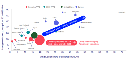 - Europe's economic disadvantage due to high power prices is apparent in a chart mapping national power prices against wind/solar generation share. China, conversely, has very competitive power prices and with 47% of its power generation forecast to come from wind and solar by 2035, combined with its dominance of the renewable's technology supply chain, power prices are expected to remain low.
