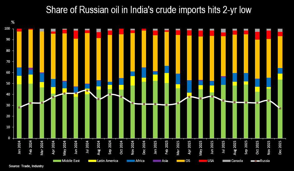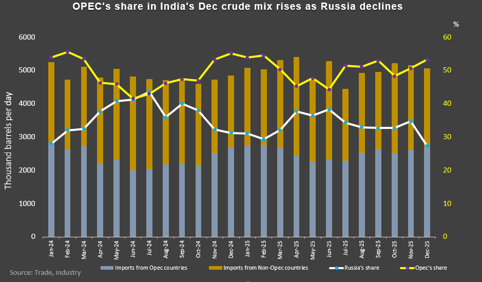 India's Russian oil imports fell to their lowest in two years in December, while OPEC's share of imports hit an 11-month high, trade data showed.