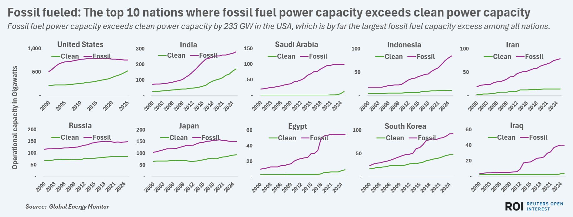 At the other end of the fossil fuel versus clean power capacity spectrum is the United States, which had 233 GW more fossil fuel capacity than clean capacity in operation in 2025, more than any other nation.