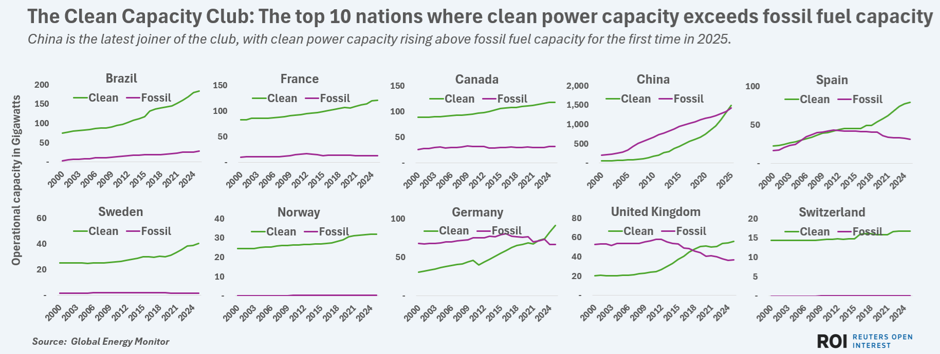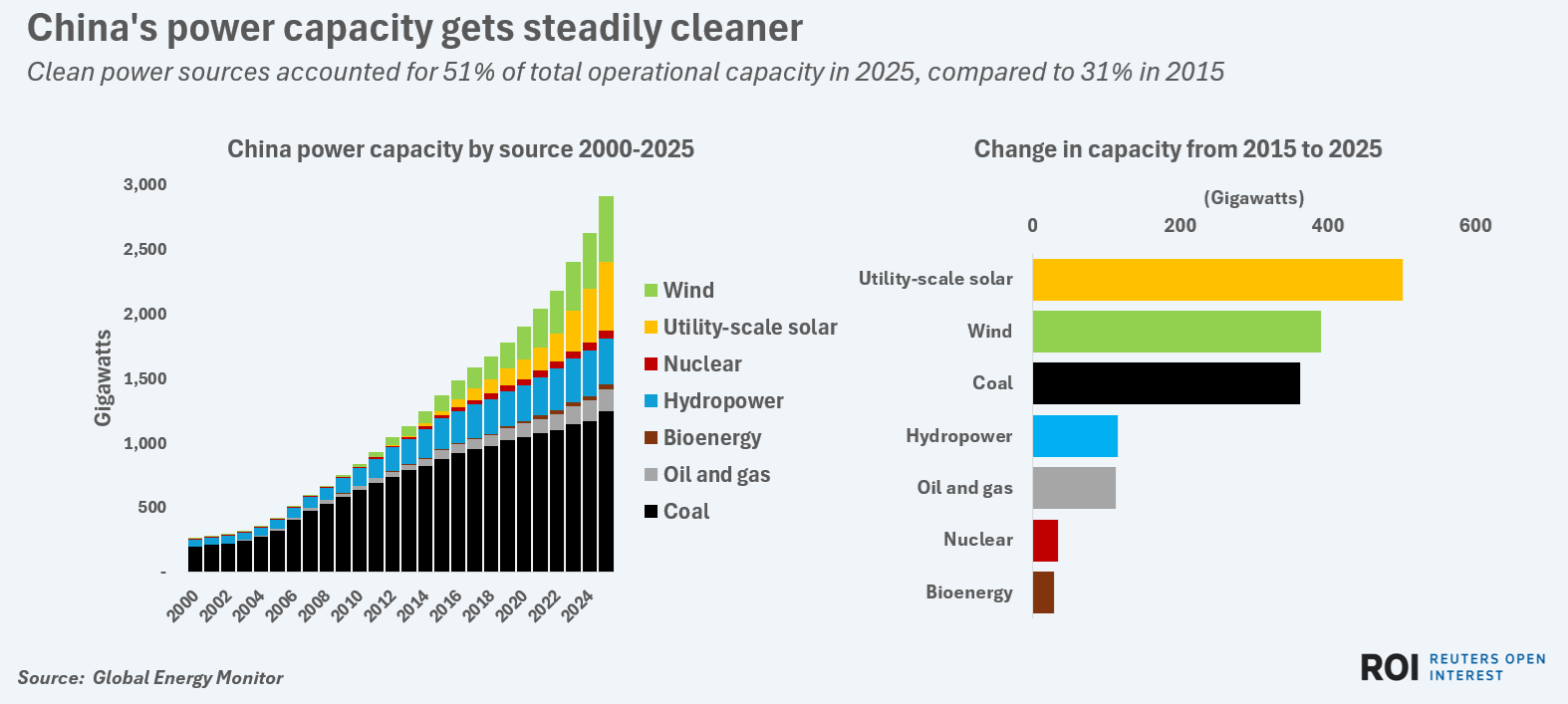 China had 1,494 gigawatts (GW) of clean power generation capacity in operation in 2025, compared to 1,420 GW of capacity fueled by coal, natural gas and other fossil fuels, data from Global Energy Monitor shows.
