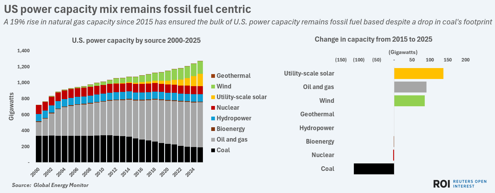 As the current U.S. administration has cut federal support for renewables and is backing further growth in natural gas and coal power, the U.S. looks set to widen its fossil fuel capacity lead even as China maintains clean growth momentum.
