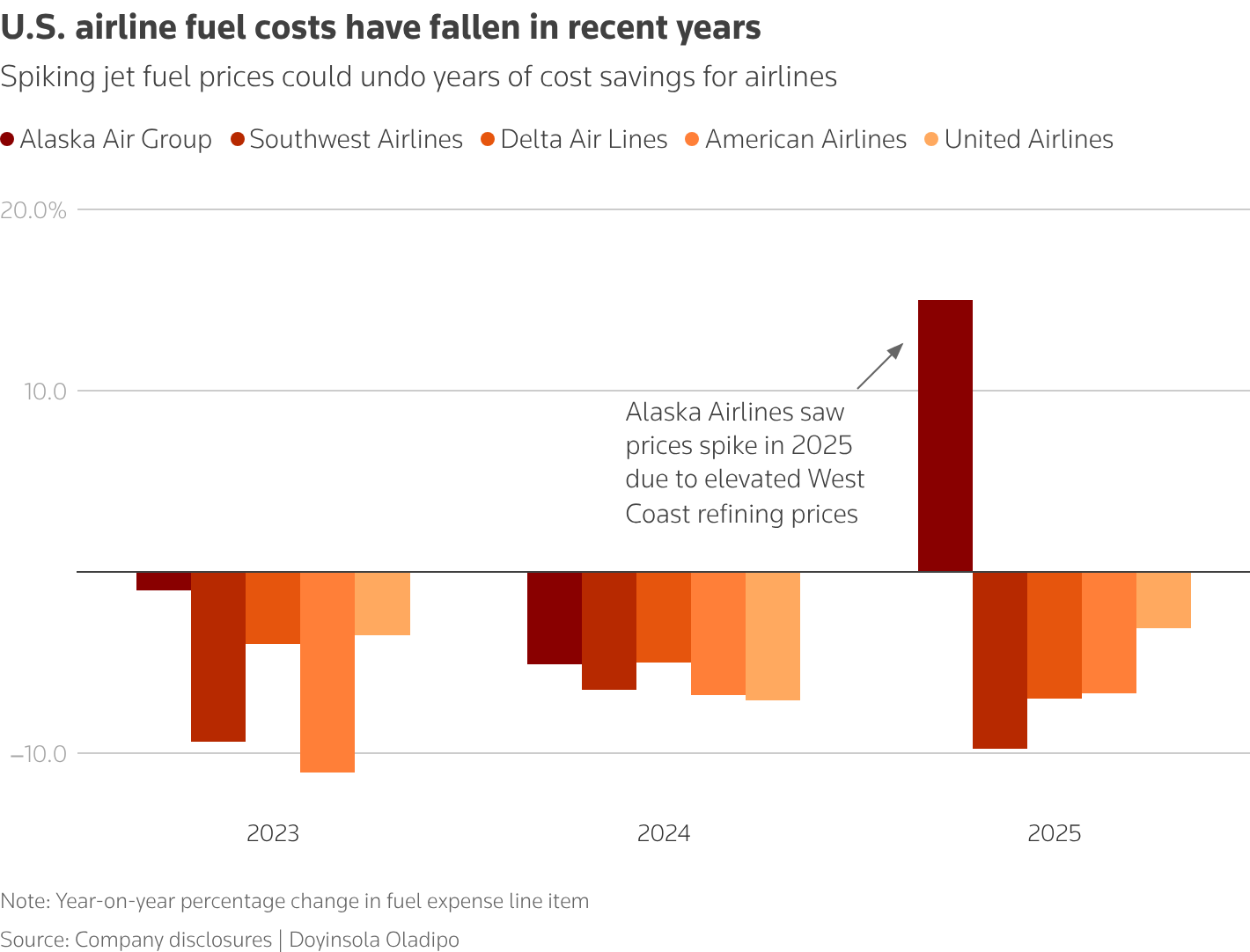 Fuel is the second-largest expense for air carriers after labor, typically accounting for a fifth to a quarter of operating expenses, and U.S. airlines largely stopped hedging that cost over the past two decades. Southwest, an active hedger in the past, ended the practice in 2025, calling it expensive and unreliable. European and Asian companies, including Air France-KLM and Cathay Pacific, maintain active hedging books.