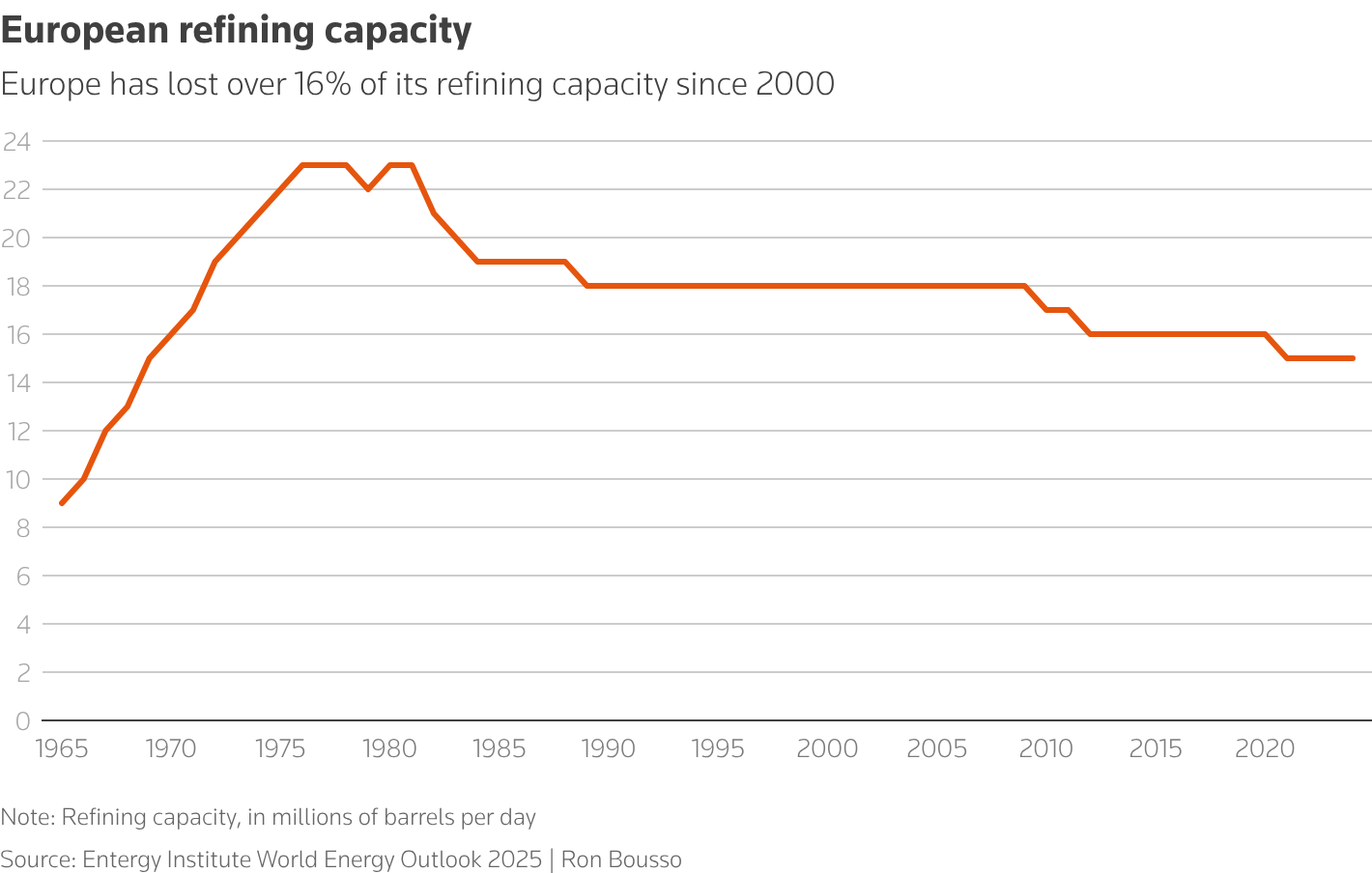 Europe’s oil and gas industry has shrunk dramatically over the past 25 years: North Sea production has dwindled and more than 30 refineries - 16% of refining capacity - have been shuttered across the continent.