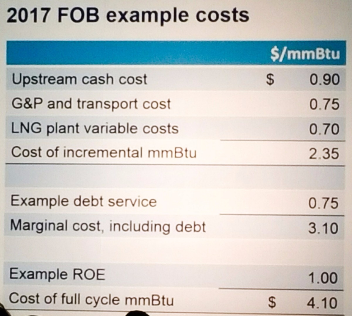 Mr. Souki gave an example of 2017 FOB costs for US LNG that pegged the full-cycle cost at $4.10/MMBtu. The full cost breakdown is shown in the slide capture.