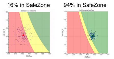 The left-hand chart shows a period of unsafe operation; it is only in the safe operating window 16% of the time and has wide operating variation (the spread of data points). This leads to a wide safety margin required to ensure safe operation (yellow band). The right-hand chart shows much better performance with tighter operational control and, subsequently, can operate safely with a narrower safety margin. This allows improved operating state visibility and operating closer to the optimum for improved profit potential.
