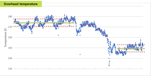 As a result of using this different definition of safe performance, a refiner was able to reduce its overhead column top operation by approximately 25°F (FIG. 2) to increase distillate yield without sacrificing reliability. Due to favorable distillate margins, captured profit was estimated at $1.5 MM/yr.