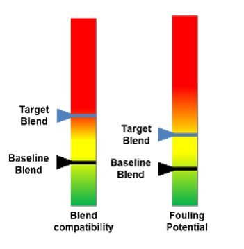 To help determine the impact of substitution on processing, a recently commercialized technique was deployed using two new tests coupled with advanced analytics to quantify blend compatibility and fouling potential. The tests both quickly “fingerprint” crude oils using IR spectroscopy and separately measure organic and inorganic solids that lead to fouling to develop quantified results previously not measured. It was determined that replacing the traditional crude oil with the LTO would markedly increase both blend compatibility and fouling-related issues (FIG. 3), and identified a significant root cause of fouling related to organic solids deposition. Coupling the current operating challenges related to fouling with this new data, an action plan was developed using chemical treatment mitigation and managed with continued monitoring. A crude preheat anti-foulant program was initiated and the frequency of crude stabilizer injection was increased. Changes in blend compatibility and fouling potential were used to manage injection type and rates.