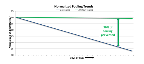 As a result of the new treatment and monitoring programs, the opportunity LTO crude oil was able to completely replace the traditional baseline crude oil blend. At the same time, system performance was markedly improved. Over 95% of fouling in the crude unit was avoided (FIG. 4) and, importantly, preheat exchanger cleanings between unit shutdowns were eliminated. Based on the lower crude oil price, higher heat transfer efficiency, elimination of cleaning cost and avoided rate reductions, the net profit increase was estimated at almost $6 MM/yr after accounting for increased treatment and monitoring costs.