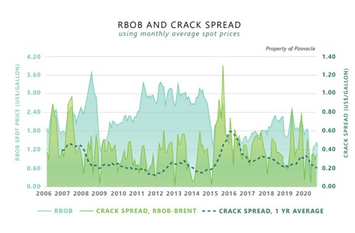 FIG. 1. RBOB and crack spread using monthly average spot prices. (Source: EIA)