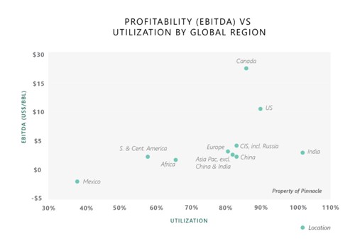 FIG. 2. Profitability [earnings before interest, taxes, depreciation and amortization (EBITDA)] vs. utilization by global region.