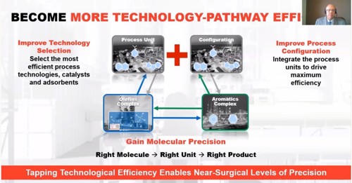 Carp explained that feedstock efficiency can be reached by selecting the best catalysts and process technologies. Another way is process integration, by which individual process units are connected to ensure that energy and intermediates are used in the best way possible. A third, less-explored approach is molecular management—a proactive design of an integrated complex to direct the feed molecules to the process units in which they can create the maximum value.