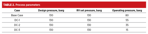 RV considerations. The RV installed on the test separator is sized for the fire case scenario (pool fire). Originally, the RV was set at 130 barg to align with the higher operating pressure of the facility during the initial design phase. Presently, the facility’s operating pressure has been reduced due to various wells depletion operating modes, as presented in TABLE 2. The latest depletion mode “DC-3” operates at approximately 15 barg (inlet to the station), while the RV set pressure remains at 130 barg.