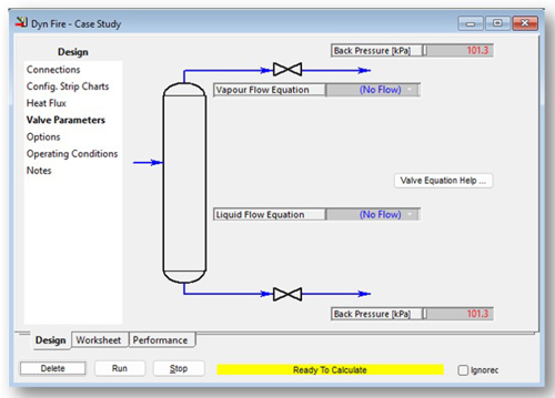Valve parameters. Once the heat flux and heat loss parameters are defined, the valve parameters (FIG. 8) can be defined specifying no flow from either the vapor/liquid outlets, simulating the vessel wall temperature up to the RV set point (SP).