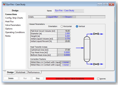 Heat loss parameters. A detailed heat loss model is used along with specifying the metal thickness for conductive heat transfer and taking no credit for the vessel insulation. It is necessary to ensure the fire duty is applied to the outside vessel wall, as shown in FIG. 6.