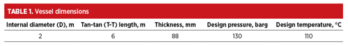 According to API 521,1 the normal liquid level (NLL) is used to determine the wetted surface area, which is then used to calculate the rate of vapor generation. In this case, the NLL for the vessel is obtained from the general arrangement drawing (GAD) and corresponds to 55% of the total vessel volume. However, instead of considering only the wetted area, the entire cylindrical surface is considered for heat transfer. This approach is chosen because the objective is to assess the vessel survivability, rather than the amount of vapor generation, which is typically relevant to RV sizing. The cylindrical vessel area—excluding the bottom since the vessel is supported with a skirt, and the head since it is higher than 7.6 m above the source of the flamecan be calculated using Eq. 1, which matches the area estimated by the proprietary modeling softwarea (~37.5 m2):