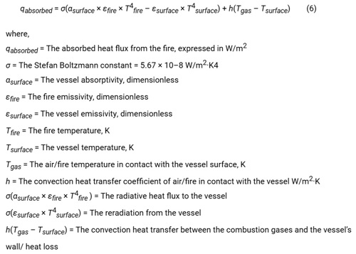 • Stefan Boltzmann Fire Mode (Eq. 6): This equation considers radiation and heat flow associated with natural convection at the vessel walls: