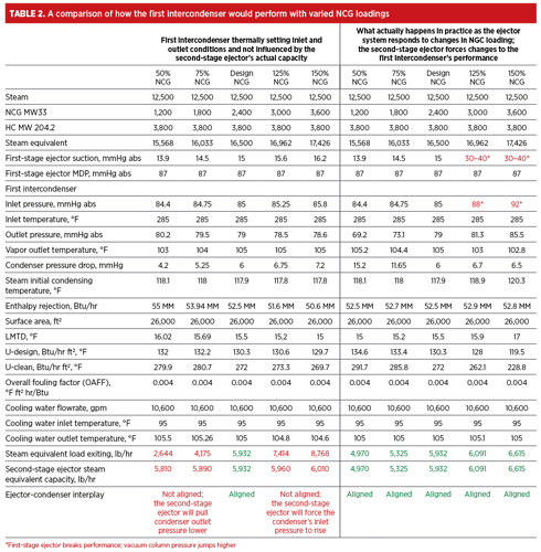 TABLE 2 provides a comparison for how the first intercondenser would perform with varied NCG loadings while not being influenced by the performance of the second-stage ejector, and what actually occurs in practice as the ejector system responds to changes in NCG load.